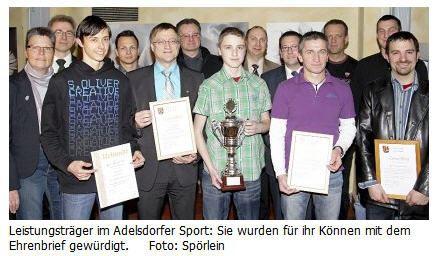 Der Ehrenbrief ging auch an Florian Milles, ebenfalls Sportschütze. Milles belegte bei den Oberfränkischen Meisterschaften 2009 in seiner Altersklasse den dritten Platz. Für den Tennisverein Adelsdorf (TVA) nahm den Ehrenbrief stellvertretend deren Vorstand für den Sportbetrieb, Jochen Lindner entgegen.