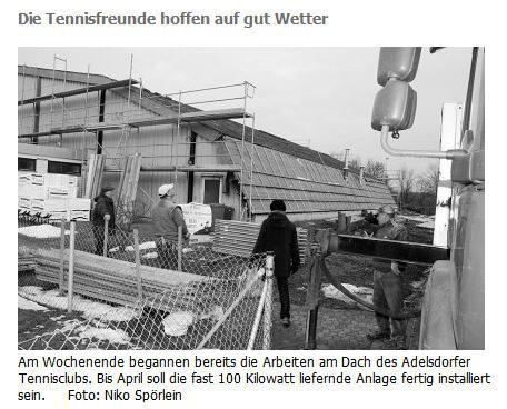 Vom Ja der Mitglieder des Tennisvereines Adelsdorf (TVA) zur Installation einer Photovoltaikanlage auf dem Dach der Tennishalle wird der Vorsitzende Thomas Zeitler wahrscheinlich spätestens dann erfahren, wenn er im Internet auf www.nn-herzogenaurach.de klickt. Er weilt zur Zeit beruflich in Indien.