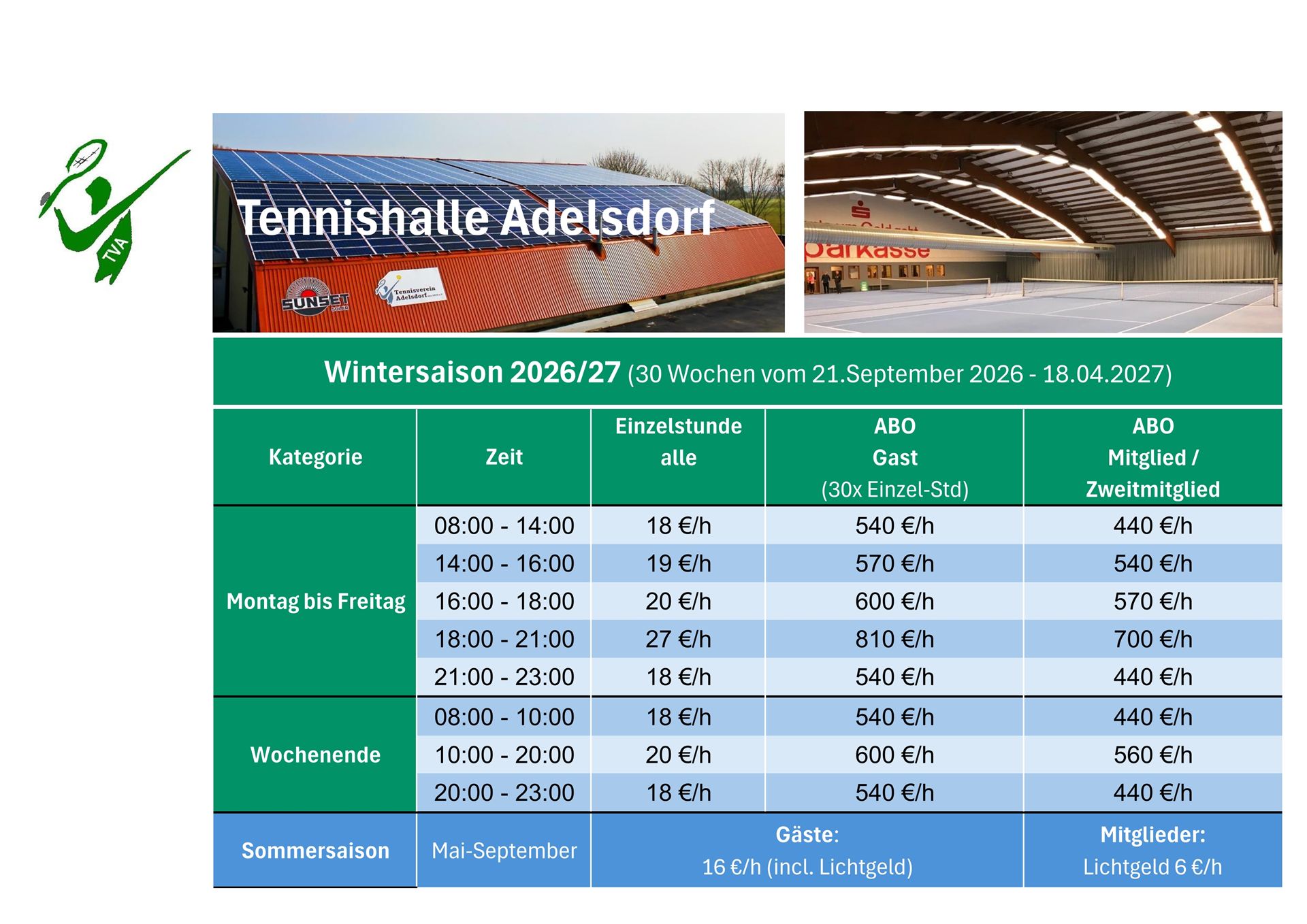 Platzreservierungen, die über die Anzahl der gebuchten ABO-Stunden hinausgehen, werden im April zum Ende der Hallensaison nachberechnet.